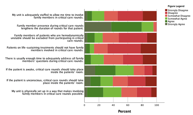 This study highlighted nursing perspectives of FCR in six adult critical care units across four Southwestern Ontario hospitals. Most critical care nurses in this study were overall supportive of FCR. Nurses reported that a lack of time was identified as a large structural barrier. Supporting nurses through structural resources, such as adequate staffing and a standardized structure of rounds, may be beneficial. Nurses felt that families who participated in FCR could make better care decisions, and the overall quality of care increased. Processes, such as the perception of increased family stress and anxiety, may impact nurses’ willingness to incorporate families into FCR. Developing a standardized