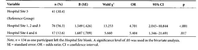 correctly 72.4% of the time. The model demonstrates that participants from hospital sites 1, 2, and 3 are 4.7 (95% CI =2.045–10.844, B = 1.549, SE = .426, Wald χ2 = 13.253, p <.001)