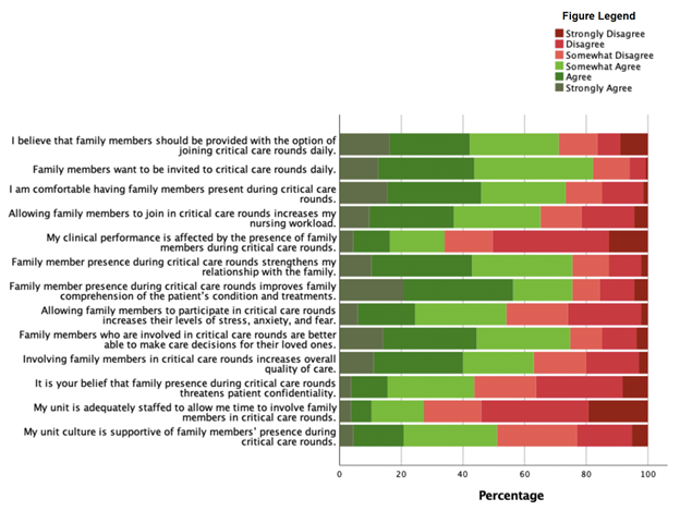 structure for family-centred rounds, such as preemptively deciding what topics to discuss during rounds and providing an opportunity for families to ask questions after rounds, may help increase nursing support for FCR and help providers manage their time better. Nurses noted that the greatest advantage of FCR was that the healthcare team could update the family on the patient’s condition, and the greatest barrier was the inconsistent or unknown timing of rounds. Finally, it highlighted that participants’ ethnicity and the hospital site where they are employed are statistically significantly associated with their overall supportiveness of FCR. Future research should investigate factors that may contribute to these significant results. This research helped to fill the knowledge gap regarding nursing perspectives of FCR in adult critical care units. It will help future researchers develop