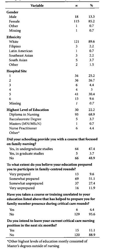 For the final research question, the independent nurse-related factors that were studied included age, number of years as an RN, number of years in critical care, experience with FCR, gender, ethnicity, hospital site, highest level of education, if they took a family nursing course in school, if they felt their education prepared them for FCR, and if they had any intention to leave their current critical care position within six months. Some categorical
